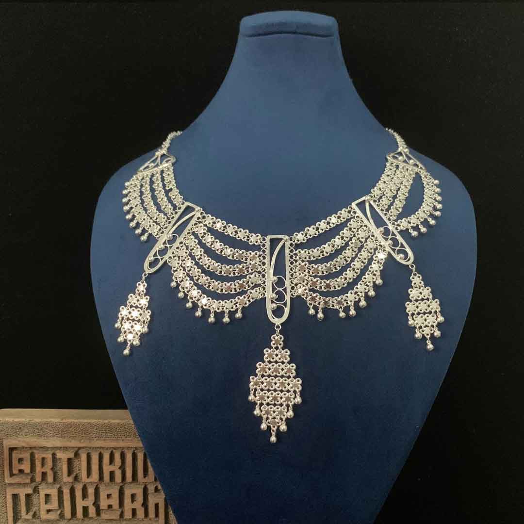 Artuklu Telkari, tarihi gümüş işleme sanatını, günümüz modern takı işlemeciliğiyle birleştirerek, tamamen müşterisine özel tasarımlar üretmektedir. Artuklu Telkari de, güvenli ve kolay alışveriş imkanı ile gümüş işleme ve altın kaplama gümüş çeşitleri bulunmaktadır. İncelediğiniz, 5 Sıra Urfa Akıtması Gümüş Kolye tamamen el işçiliği ile size özel üretilecektir.