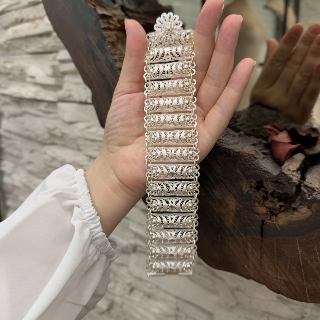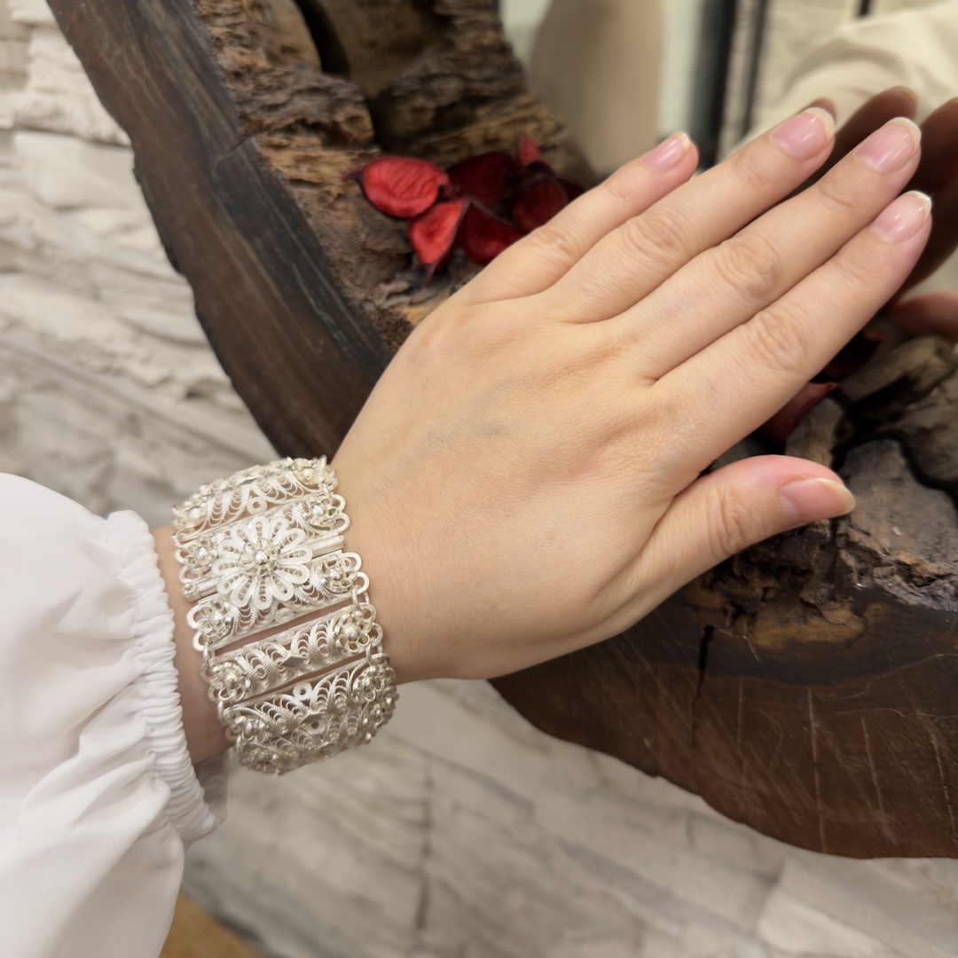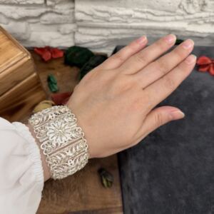 Artuklu Telkari, tarihi gümüş işleme sanatını, günümüz modern takı işlemeciliğiyle birleştirerek, tamamen müşterisine özel tasarımlar üretmektedir. Artuklu Telkari de, güvenli ve kolay alışveriş imkanı ile gümüş işleme ve altın kaplama gümüş çeşitleri bulunmaktadır. İncelediğiniz, 925 Ayar Gümüş Telkari Fişekli Bayan Bilekliği tamamen el işçiliği ile size özel üretilecektir.