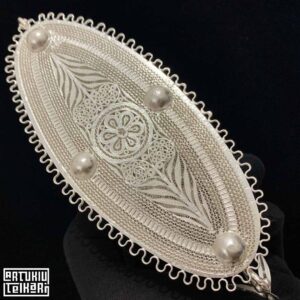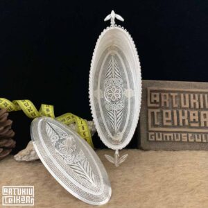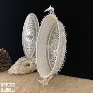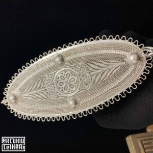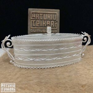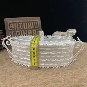 Artuklu Telkari, tarihi gümüş işleme sanatını, günümüz modern takı işlemeciliğiyle birleştirerek, tamamen müşterisine özel tasarımlar üretmektedir. Artuklu Telkari de, güvenli ve kolay alışveriş imkanı ile gümüş işleme ve altın kaplama gümüş çeşitleri bulunmaktadır. İncelediğiniz, 950 Ayar Telkari Gümüş Biblo Şekerlik tamamen el işçiliği ile size özel üretilecektir.