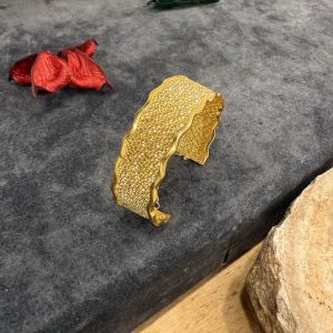Artuklu Telkari, tarihi gümüş işleme sanatını, günümüz modern takı işlemeciliğiyle birleştirerek, tamamen müşterisine özel tasarımlar üretmektedir. Artuklu Telkari de, güvenli ve kolay alışveriş imkanı ile gümüş işleme ve altın kaplama gümüş çeşitleri bulunmaktadır. İncelediğiniz, Altın Kaplama Gümüş Kleopatra Bilezik tamamen el işçiliği ile size özel üretilecektir.