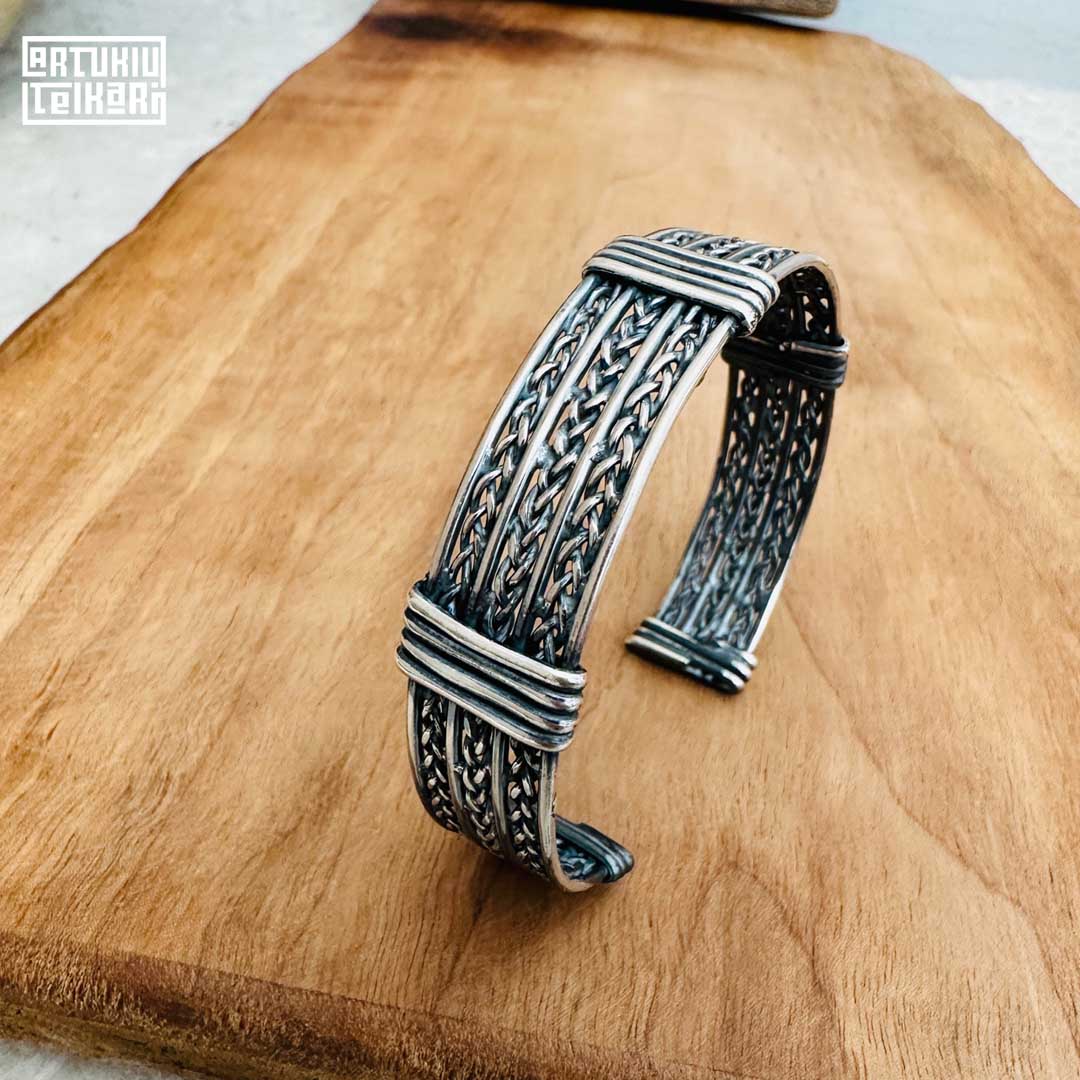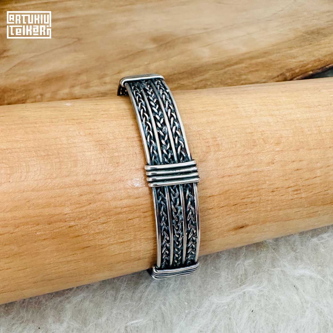 Artuklu Telkari, tarihi gümüş işleme sanatını, günümüz modern takı işlemeciliğiyle birleştirerek, tamamen müşterisine özel tasarımlar üretmektedir. Artuklu Telkari de, güvenli ve kolay alışveriş imkanı ile gümüş işleme ve altın kaplama gümüş çeşitleri bulunmaktadır. İncelediğiniz, Gümüş Erkek Bileziği tamamen el işçiliği ile size özel üretilecektir.