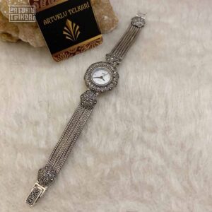 Artuklu Telkari, tarihi gümüş işleme sanatını, günümüz modern takı işlemeciliğiyle birleştirerek, tamamen müşterisine özel tasarımlar üretmektedir. Artuklu Telkari de, güvenli ve kolay alışveriş imkanı ile gümüş işleme ve altın kaplama gümüş çeşitleri bulunmaktadır. İncelediğiniz, Hasır Kordonlu Markazit Gümüş Bayan Saati bileğinize özel imal edilecektir.