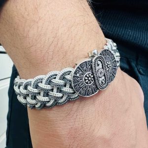 Artuklu Telkari, tarihi gümüş işleme sanatını, günümüz modern takı işlemeciliğiyle birleştirerek, tamamen müşterisine özel tasarımlar üretmektedir. Artuklu Telkari de, güvenli ve kolay alışveriş imkanı ile gümüş işleme ve altın kaplama gümüş çeşitleri bulunmaktadır. İncelediğiniz, Hitit Motifli Midyat Hasırı Erkek Bilekliği tamamen el işçiliği ile size özel üretilecektir.
