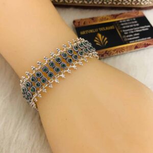 Artuklu Telkari, tarihi gümüş işleme sanatını, günümüz modern takı işlemeciliğiyle birleştirerek, tamamen müşterisine özel tasarımlar üretmektedir. Artuklu Telkari de, güvenli ve kolay alışveriş imkanı ile gümüş işleme ve altın kaplama gümüş çeşitleri bulunmaktadır. İncelediğiniz, Kök Zümrüt Taşlı Gümüş Bayan Bilekliği tamamen el işçiliği ile size özel üretilecektir.