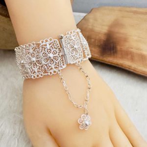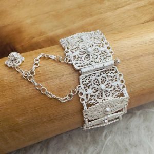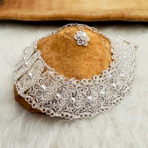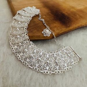 Artuklu Telkari, tarihi gümüş işleme sanatını, günümüz modern takı işlemeciliğiyle birleştirerek, tamamen müşterisine özel tasarımlar üretmektedir. Artuklu Telkari de, güvenli ve kolay alışveriş imkanı ile gümüş işleme ve altın kaplama gümüş çeşitleri bulunmaktadır. İncelediğiniz, Midyat Telkari Yaprak Gümüş Bileklik tamamen el işçiliği ile size özel üretilecektir.