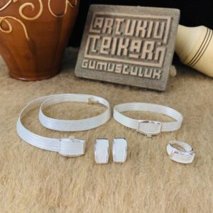 - 5 sıra bileklik, 5 sıra kolye, klasik küpe ve yüzükten oluşmaktadır.