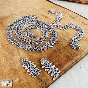Artuklu Telkari, tarihi gümüş işleme sanatını, günümüz modern takı işlemeciliğiyle birleştirerek, tamamen müşterisine özel tasarımlar üretmektedir. Artuklu Telkari de, güvenli ve kolay alışveriş imkanı ile gümüş işleme ve altın kaplama gümüş çeşitleri bulunmaktadır. İncelediğiniz, Safir Taşlı Telkari Gümüş Takı Seti tamamen el işçiliği ile size özel üretilecektir.