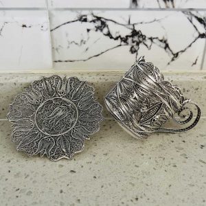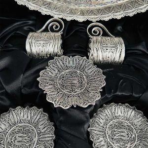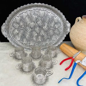 Artuklu Telkari, tarihi gümüş işleme sanatını, günümüz modern takı işlemeciliğiyle birleştirerek, tamamen müşterisine özel tasarımlar üretmektedir. Artuklu Telkari de, güvenli ve kolay alışveriş imkanı ile gümüş işleme ve altın kaplama gümüş çeşitleri bulunmaktadır. İncelediğiniz, Telkari Gümüş Çay Kahve Takımı tamamen el işçiliği ile size özel üretilecektir.