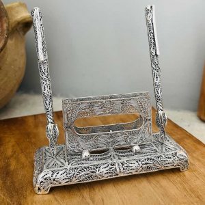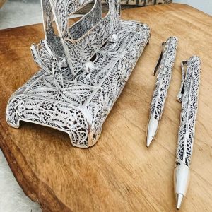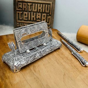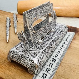 Artuklu Telkari, tarihi gümüş işleme sanatını, günümüz modern takı işlemeciliğiyle birleştirerek, tamamen müşterisine özel tasarımlar üretmektedir. Artuklu Telkari de, güvenli ve kolay alışveriş imkanı ile gümüş işleme ve altın kaplama gümüş çeşitleri bulunmaktadır. İncelediğiniz, Telkari Gümüş Çift Kalemli Masa İsimliği tamamen el işçiliği ile size özel üretilecektir.