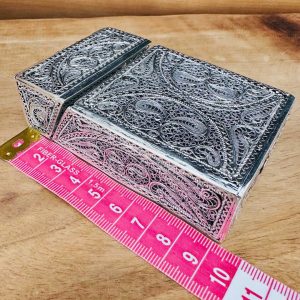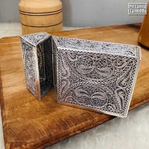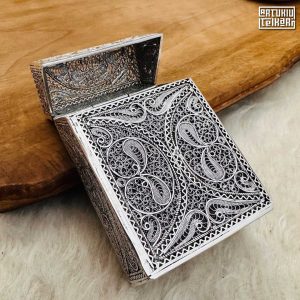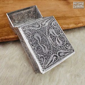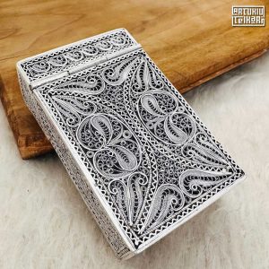 Artuklu Telkari, tarihi gümüş işleme sanatını, günümüz modern takı işlemeciliğiyle birleştirerek, tamamen müşterisine özel tasarımlar üretmektedir. Artuklu Telkari de, güvenli ve kolay alışveriş imkanı ile gümüş işleme ve altın kaplama gümüş çeşitleri bulunmaktadır. İncelediğiniz, Telkari Gümüş Sigara Paket Kılıfı tamamen el işçiliği ile size özel üretilecektir.