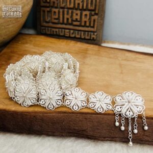 Artuklu Telkari, tarihi gümüş işleme sanatını, günümüz modern takı işlemeciliğiyle birleştirerek, tamamen müşterisine özel tasarımlar üretmektedir. Artuklu Telkari de, güvenli ve kolay alışveriş imkanı ile gümüş işleme ve altın kaplama gümüş çeşitleri bulunmaktadır. İncelediğiniz, Telkari Papatya Gümüş Bayan Kemeri tamamen el işçiliği ile size özel üretilecektir.