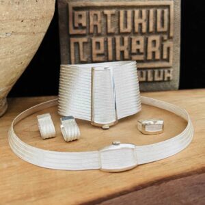 Artuklu Telkari, tarihi gümüş işleme sanatını, günümüz modern takı işlemeciliğiyle birleştirerek, tamamen müşterisine özel tasarımlar üretmektedir. Artuklu Telkari de, güvenli ve kolay alışveriş imkanı ile gümüş işleme ve altın kaplama gümüş çeşitleri bulunmaktadır. İncelediğiniz, Trabzon Hasırı Gümüş Takı Seti tamamen el işçiliği ile size özel üretilecektir.