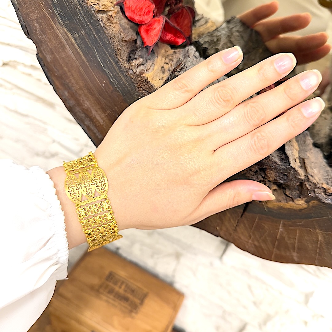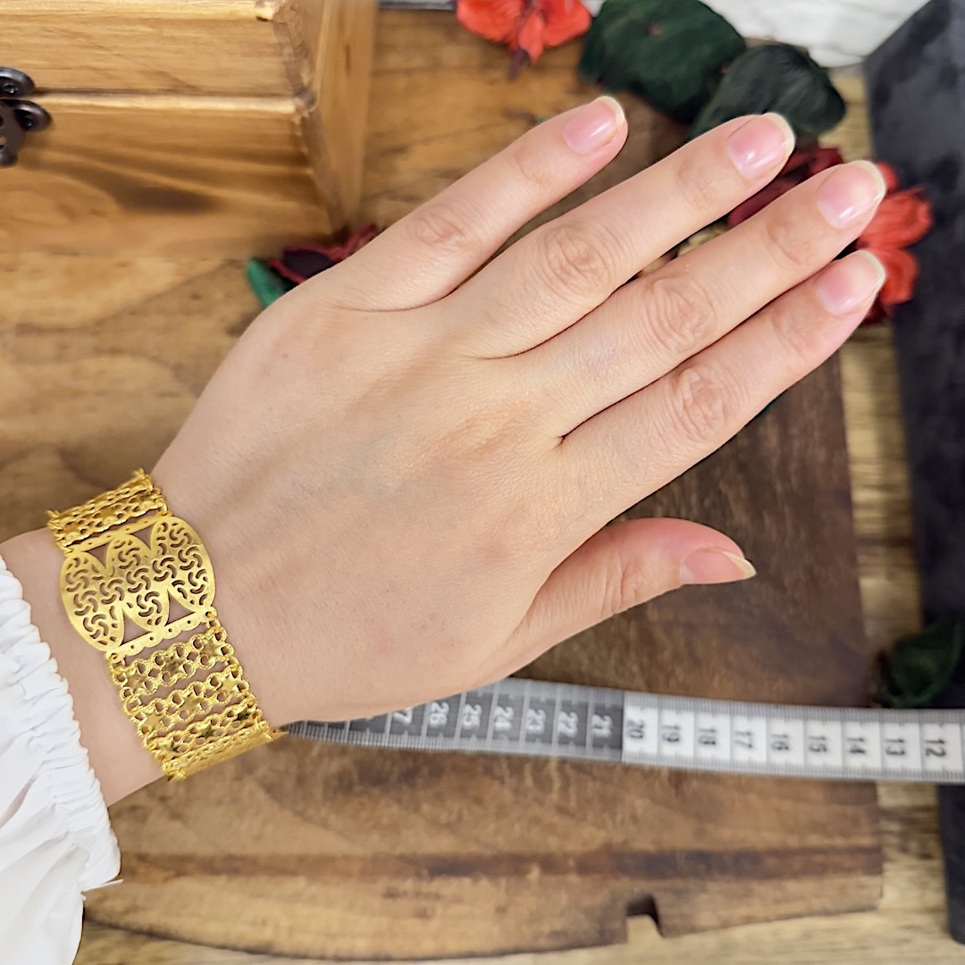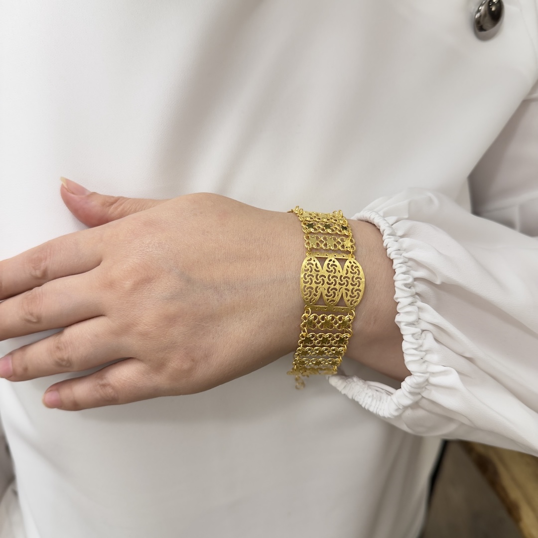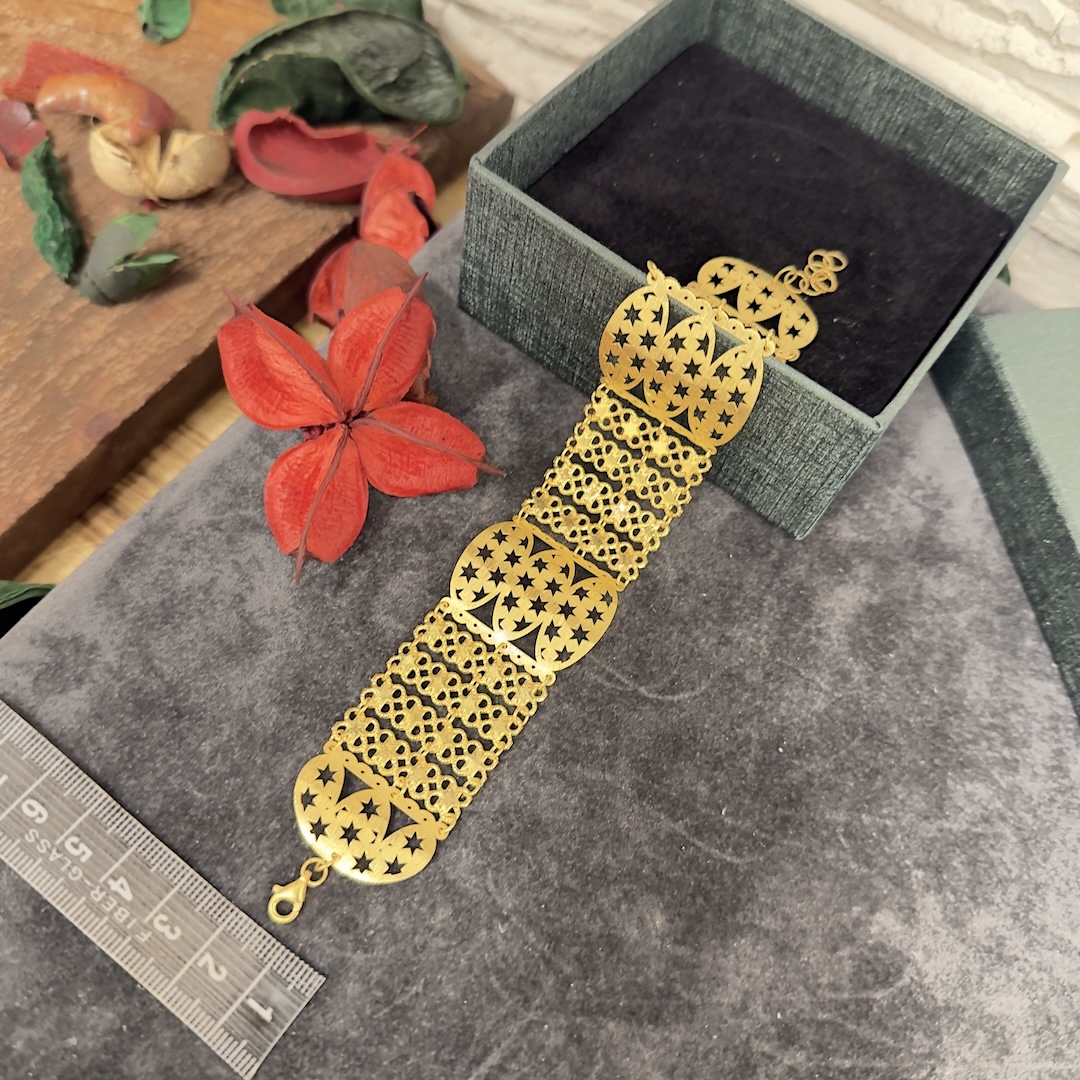 Artuklu Telkari, tarihi gümüş işleme sanatını, günümüz modern takı işlemeciliğiyle birleştirerek, tamamen müşterisine özel tasarımlar üretmektedir. Artuklu Telkari de, güvenli ve kolay alışveriş imkanı ile gümüş işleme ve altın kaplama gümüş çeşitleri bulunmaktadır. İncelediğiniz, Yıldızlı Altın Modeli Gümüş Bayan Bilekliği tamamen el işçiliği ile size özel üretilecektir.